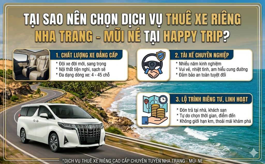 Lựa chọn thuê xe riêng từ Nha Trang đi Mũi Né không chỉ là chọn một phương tiện di chuyển, mà là chọn sự An Tâm – Riêng Tư – Tận Hưởng. Hãy để Happy Trip Đà Lạt biến hành trình của bạn thành một chuyến du lịch đúng nghĩa ngay từ bước chân đầu tiên lên xe.